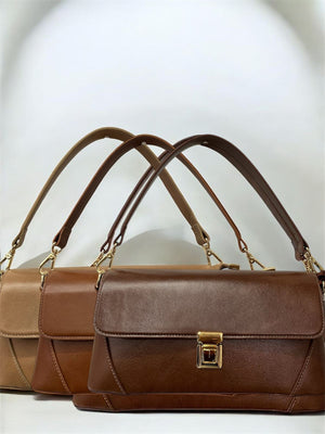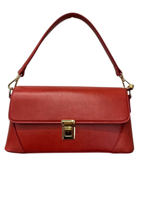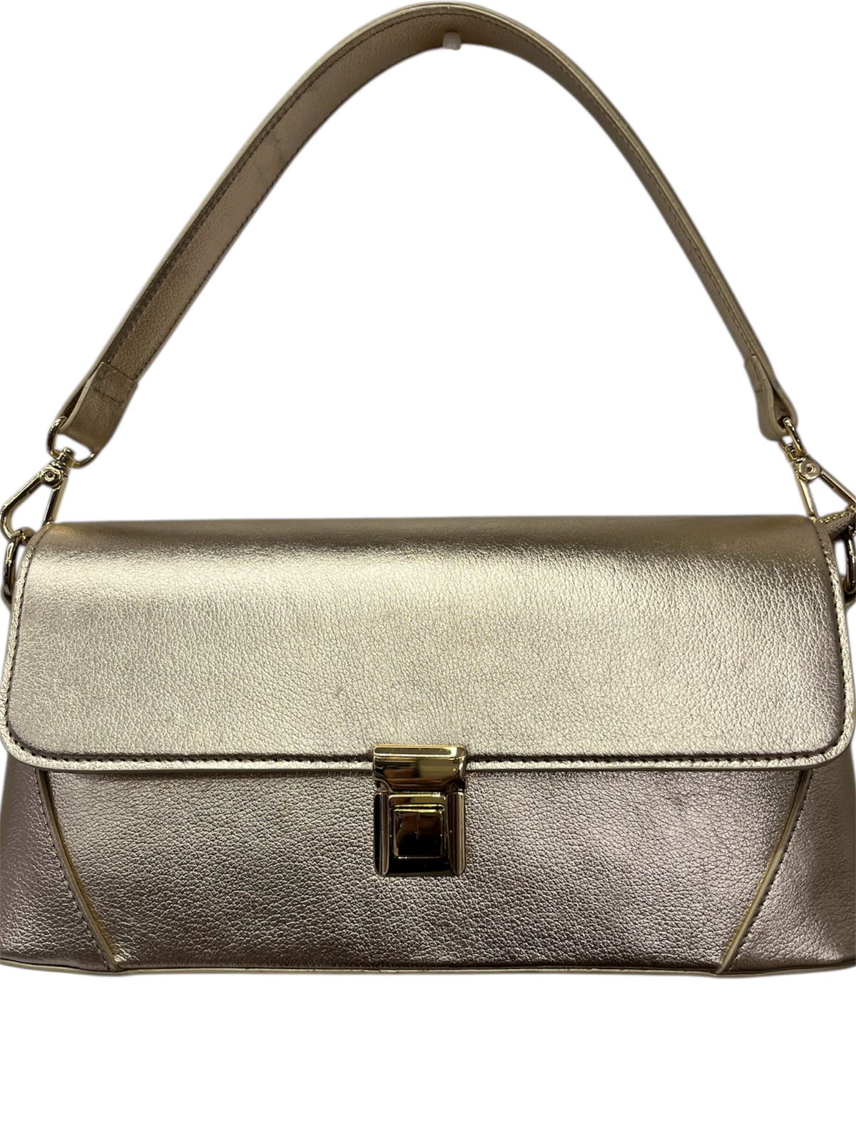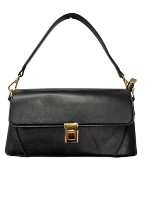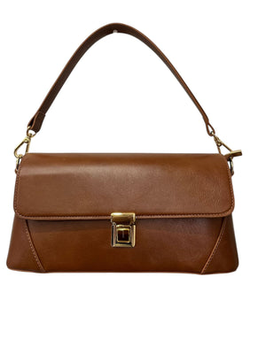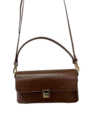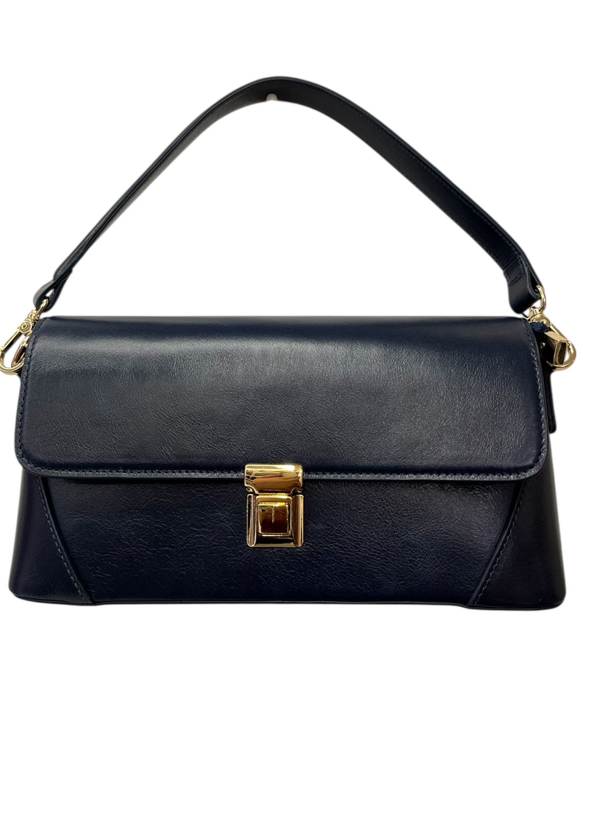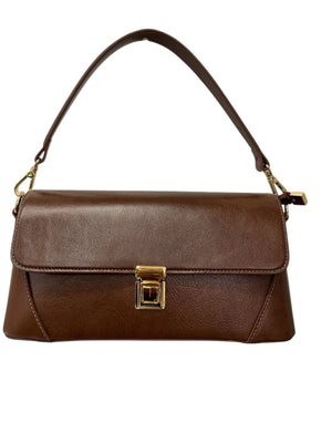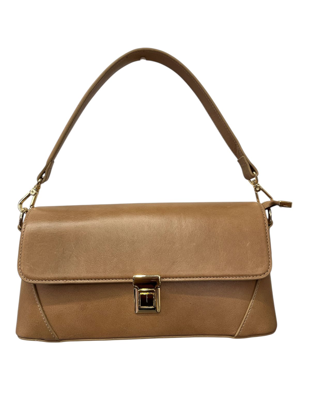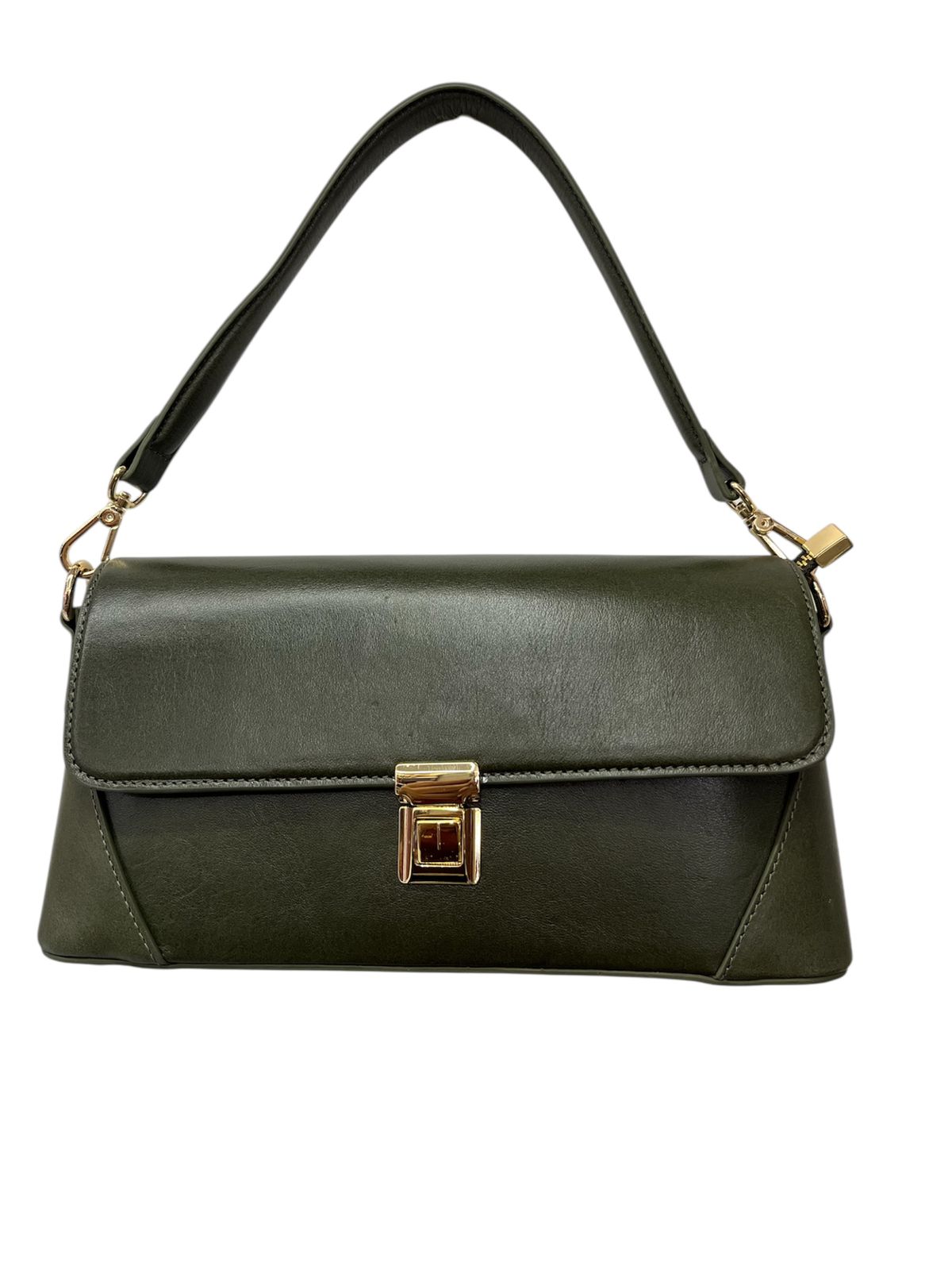 Bolsa média com design estruturado, duas alças e fecho em botão para mais praticidade.